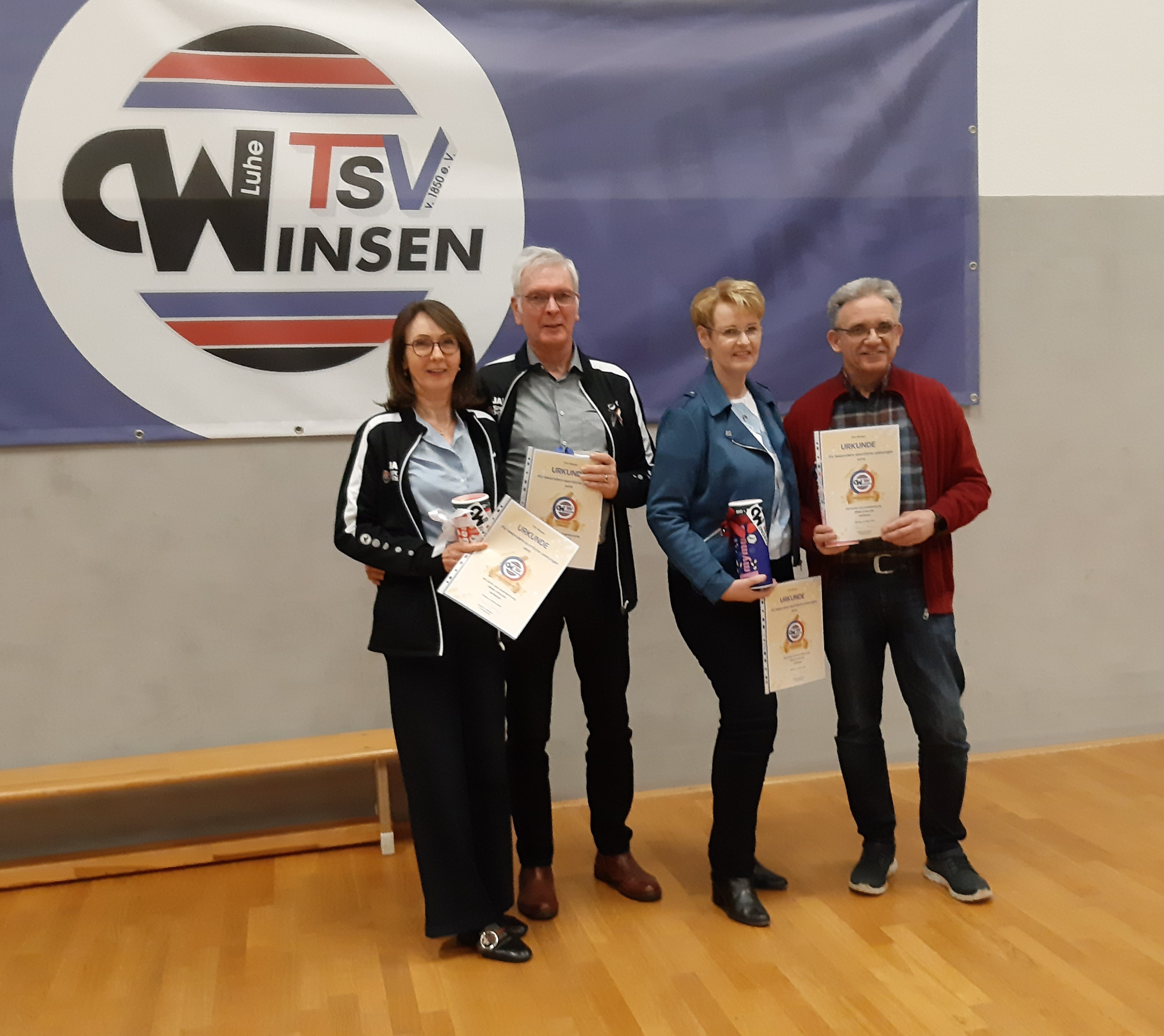 Auf der Jahreshauptversammlung des TSV Winsen wurden 2 Paare aus der Tanzsportabteilung für ihre Landesmeistertitel in der Senioren IV B Heinz-Joachim und Ulrike (links) und Michael und Birte in der Senioren III B-Klasse geehrt.